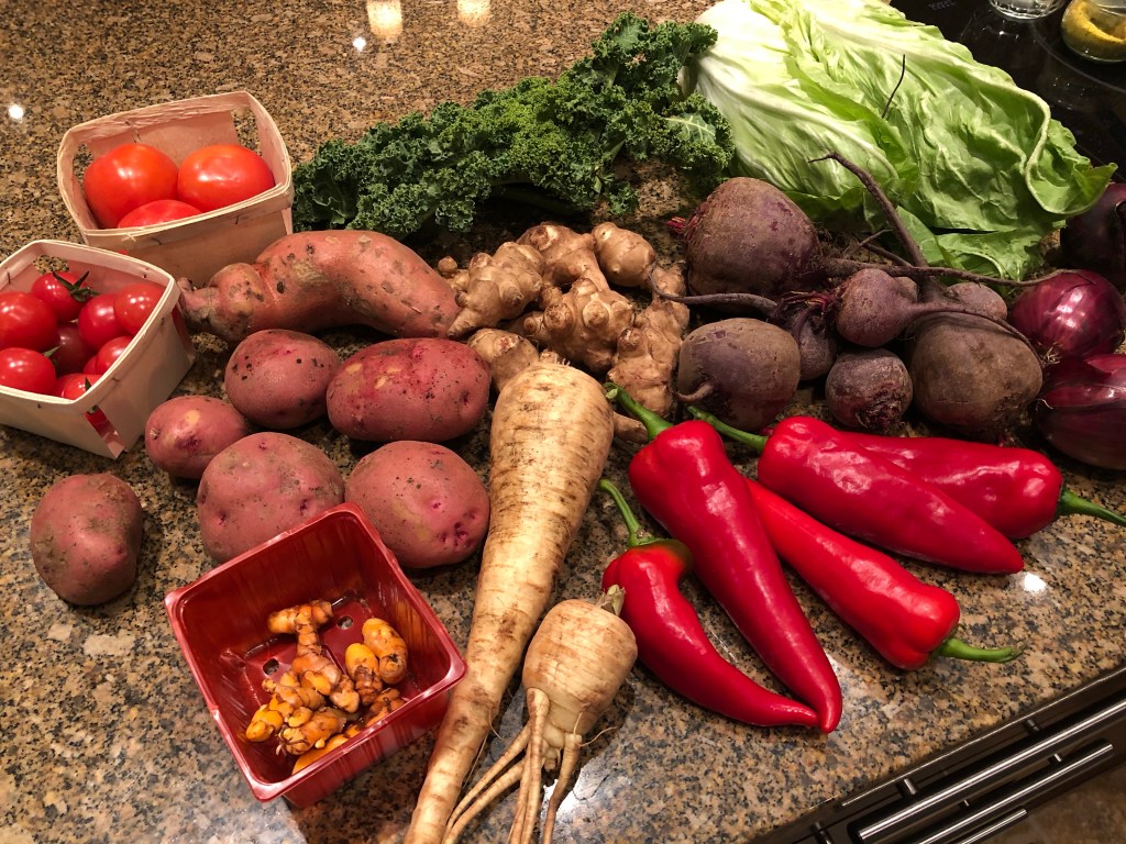 I should probably mention the basket doesn’t come with a list of what’s inside. It took me a while to search online and find out the small orange “roots” are actually turmeric. I still don’t know what are the “roots” next to the beets. Ideas?