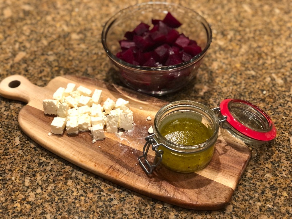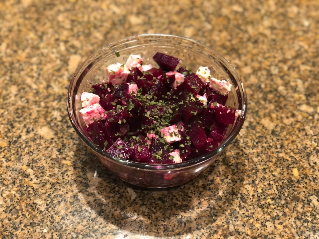 Once the beets boiled, the skin will easily peel off. Cut the beets into cubes. Do the same with the feta cheese. Combine the two and the vinaigrette and serve. Add some parsley for a nice touch.