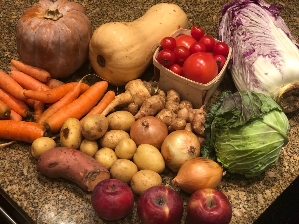 The veggie basket this week had some new stuff (2 types of pumpkins and red Napa cabbage):