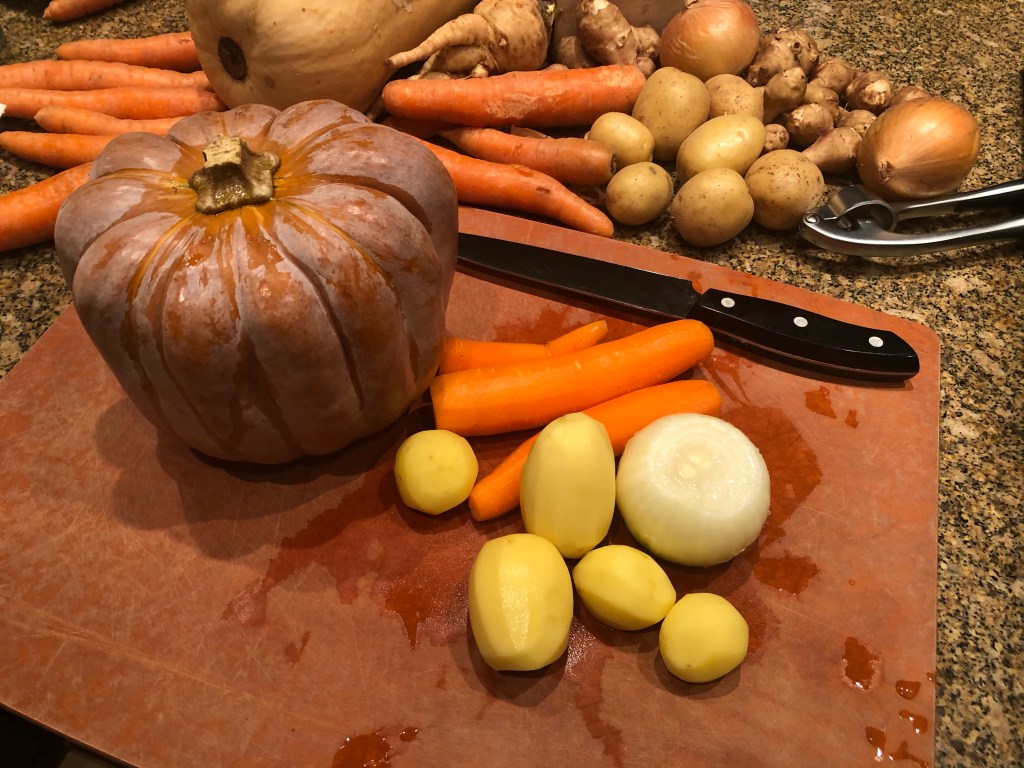 I searched immediately for a recipe with pumpkin as main ingredient and other veggies where I could substitute with the veggies in my basket. I chose the sugar pumpkin, one onion, some potatoes and carrots for a chicken curry. Original recipe can be found here.
