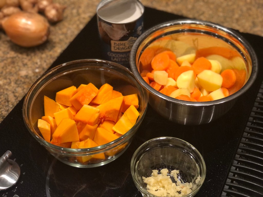 Add the coconut milk, broth, potatoes and carrots. Bring to boil and simmer over medium heat for 5 min.
