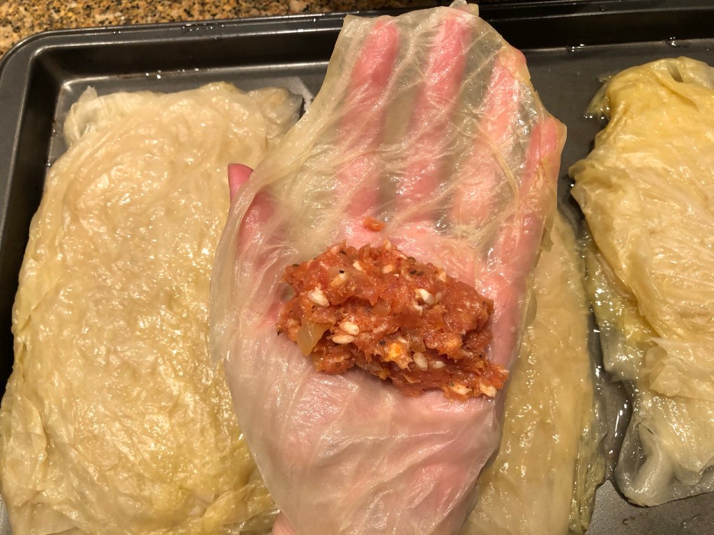 Take a cabbage leaf (that should be slightly bigger than your palm, like in the image below) and fill it with a bit of meat. Don’t overfill it, since the rice will expand during cooking.