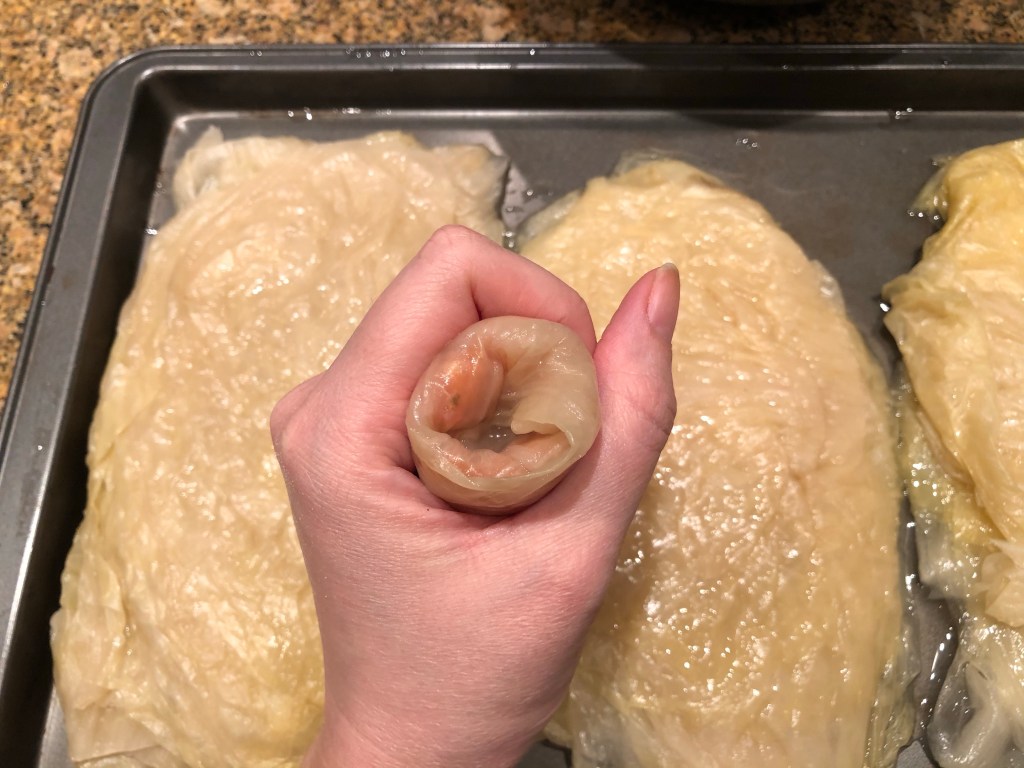 Roll the cabbage leaf in your hand, then push the cabbage inside. In the end, it should look like this: