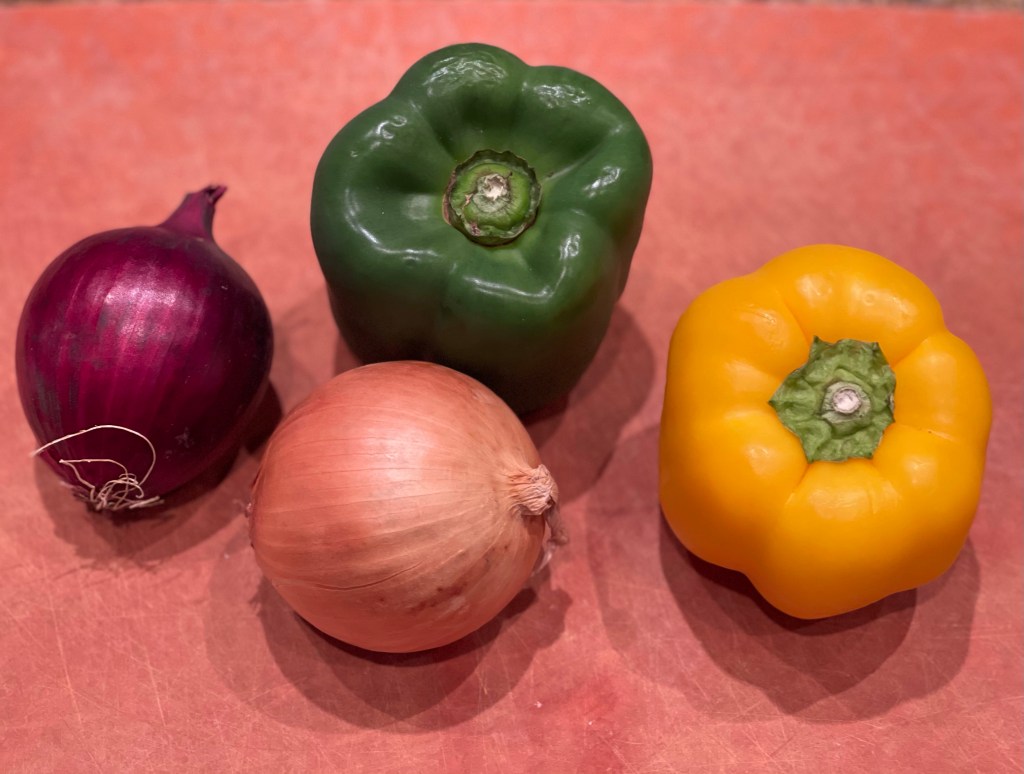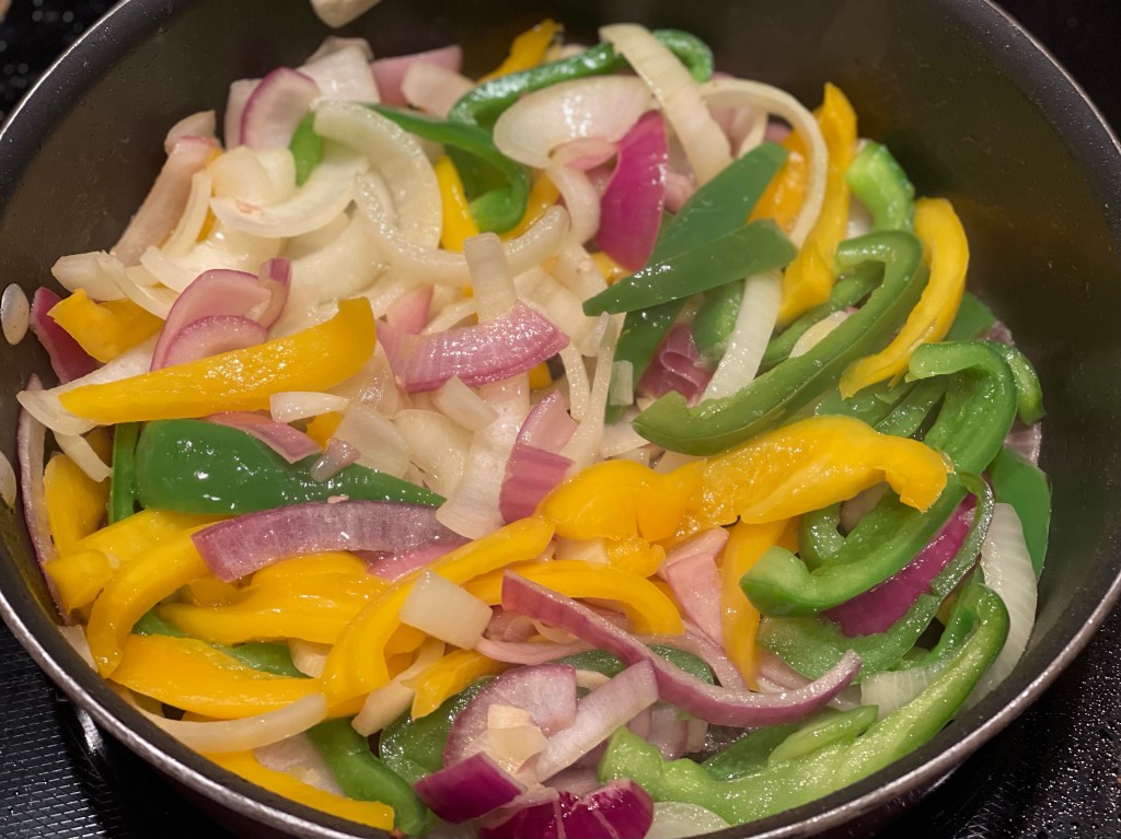 Using the same pan, add the onions and peppers to sautée. Toss, so they get coated with the oil in the pan and sear them as well, stirring often. Once they soften, add some salt and let the veggies get a good sear (blackening).