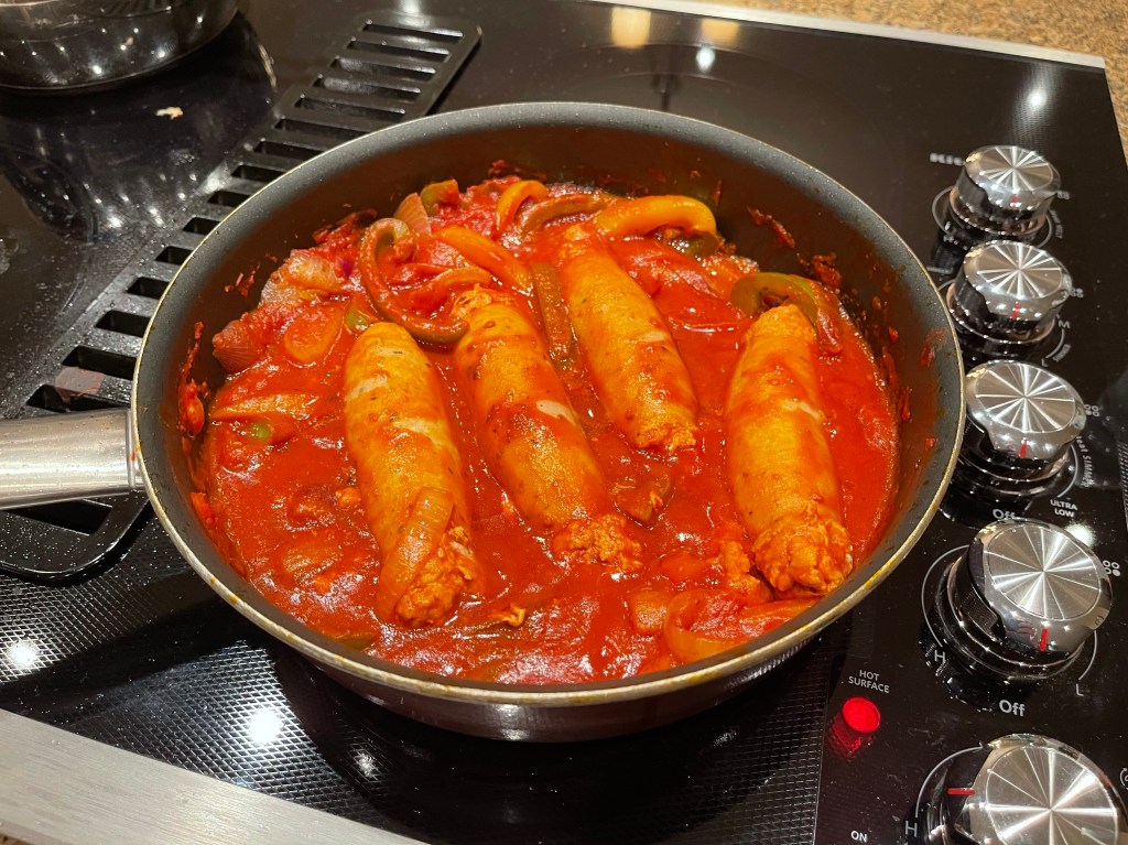 Add the tomatoes, oregano, chili flakes and combine. Add the sausages back in the pan. Bring to simmer, reduce the heat to low. Cover with lid and simmer until the peppers are soft and the sausages are cooked through (about 20 minutes or until internal temperature of the 165F).